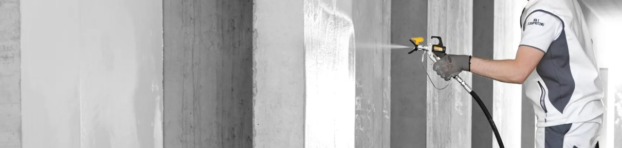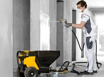 Специалист загружает состав в специальную машину и равномерно наносит на подготовленную поверхность.